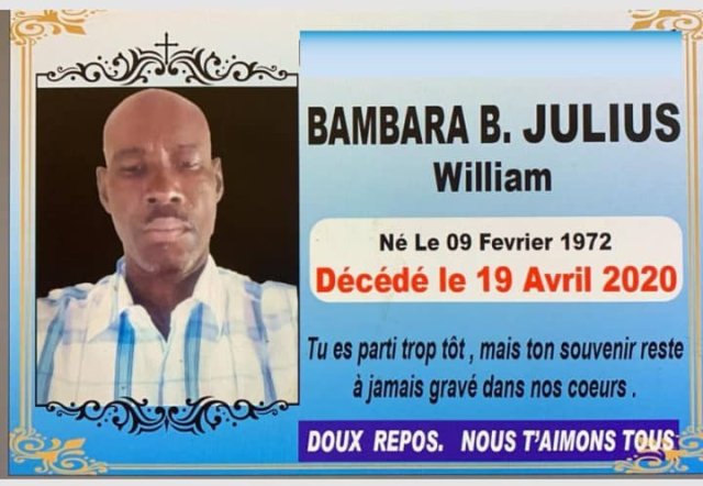 In memoria : BAMBARA B. Julius WilliamVoici 5 ans, qu’il a plu au Seigneur de rappeler auprès de lui, dans son Amour, notre cher BAMBARA B. Julius William. En souvenir de notre bien aimé, des messes seront célébrées pour le repos de son âme selon le programme suivant :