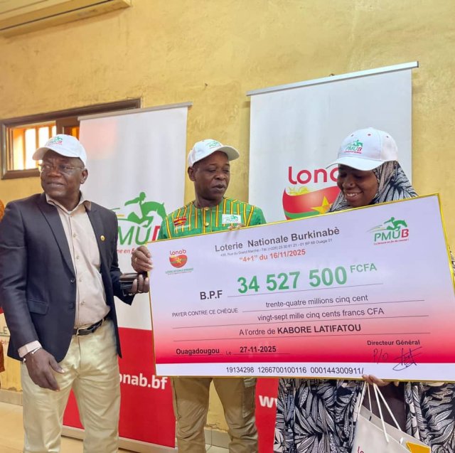 Burkina/PMU’B : Latifatou Kaboré empoche plus de 34 millions en misant 300 francs CFACe jeudi 27 novembre 2025, la Loterie nationale burkinabè a procédé à la remise d’un chèque de plus de 34 millions de francs CFA à Latifatou Kaboré, heureuse gagnante au 4+1 du 16 novembre 2025. Comme à l’accoutumée, la LONAB a fait une nouvelle gagnante. En effet, Latifatou Kaboré, commerçante, a su choisir les bons chevaux et a gagné au 4+1 du 16 novembre 2025 au Pari mutuel urbain avec une mise de 300 FCFA. Le total du cumul s’élève à 34 527 500 F CFA. Débordante de joie, la nouvelle millionnaire avait du mal à trouver des mots tant l’émotion était forte. Entre rires et silences émus, elle peinait à réaliser qu’elle venait d’intégrer le cercle des millionnaires. Yamba Jean Zida, directeur régional de la LONAB du Centre, a réitéré ses félicitations à la gagnante. Il souligne que Latifatou Kaboré n’est pas novice du jeu car elle n’est pas à son premier gain. Cependant, elle n’a pas encore remporté un gain aussi élevé. Par ailleurs, il indique que même si un gain de 34 millions de francs CFA peut paraître modeste au regard d’autres montants parfois remportés par des turfistes à travers le pays, il n’en demeure pas moins significatif. Selon ses propos, ce gain illustre surtout la régularité et la crédibilité des opérations de la LONAB. Pour lui, c’est aussi une preuve du dynamisme de l’entreprise et de la confiance que lui accordent les clients, car elle continue de faire des heureux parmi les parieurs. Il a aussi profité de l’occasion pour inviter les parieurs à toujours faire confiance à la LONAB. Muriel Dominique Ouédraogo/Clémentine Koama (stagiaires) |