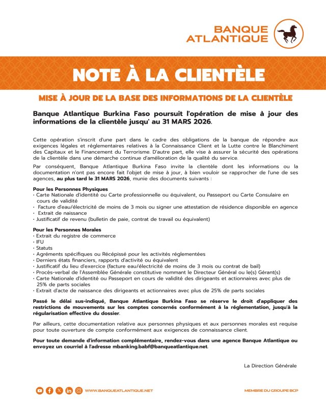 Banque Atlantique Burkina Faso prolonge la mise à jour des informations clients jusqu’au 31 mars 2026