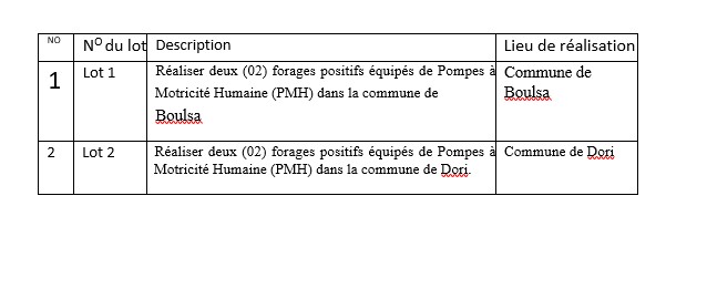 Association reconnue d’utilité publique par décret NO 2013-256/PRES/PM/MA TS/MEF du 11 avril 2013 IFIJ : 00007339 H N02026/05/SG/OCADES L’OCADES Caritas Burkina recrute des entreprises qualifiées pour la réalisation de quatre (04) forages positifs équipés de Pompes à Motricité Humaine (PMH) dans les communes de Boulsa et de Dori zones d’intervention du projet PROSPER « Projet de Renforcement de la Sécurité alimentaire et la Prospérité pour la Résilience au Burkina Faso ». Ce projet mis en œuvre avec l’appui financier de la Coopération Autrichienne pour le Développement (ADA), via le programme International Partnerships Austria, et de Caritas Autriche, s’exécute du 1er janvier 2026 au 31 décembre 2027 dans les communes de Boulsa (Koulsé) et de Dori (Séno) relevant respectivement des diocèses de Kaya et de Dori. L’objectif global de la mission d’une durée de trente (30) jours calendaires est de réaliser 04 forages positifs équipés de Pompes à Motricité Humaine (PMH) dans les communes de Boulsa et de Dori. De façon spécifique, il s’agit de réaliser deux (02) forages positifs équipés de Pompes à Motricité Humaine (PMH) dans la commune de Boulsa et de réaliser deux (02) forages positifs équipés de Pompes à Motricité Humaine (PMH) dans la commune de Dori. Cet appel d’offre est constitué de deux (02) lots repartis ainsi qu’il suit :