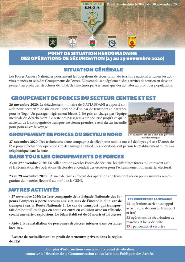 291 patrouilles et escortes, 32 opérations de sécurisation de marchés et lieux de culte, 12 opérations aériennes (appui aérien, suivi de convoi, transport et fret). Tel est le point hebdomadaire des opérations de sécurisation menées par les forces armées nationales du 23 au 29 novembre 2020. Plus d’informations dans le document joint.