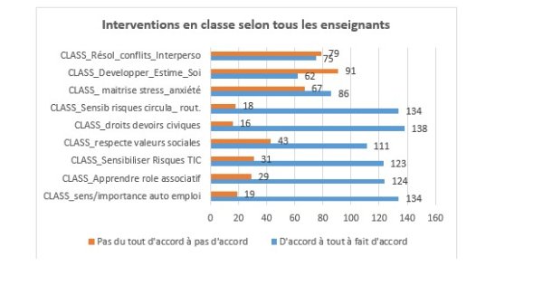 Par contre, ils estiment que leurs interventions en classe insistent davantage sur quelques aspects en lien avec les droits et les devoirs citoyens (138 oui contre une moyenne de 106 oui pour les huit autres types d’intervention) tout en occultant l’estime de soi (91 non contre une moyenne de 38 non pour les huit autres types d’intervention). Une bonne estime de soi représente la vision positive de sa valeur personnelle, laquelle vision influence positivement l’attitude, la capacité à agir et les relations interpersonnelles.
