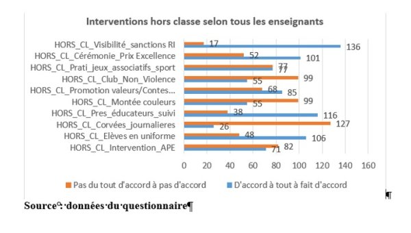 Elles (interventions hors de la classe) mettent l’accent sur les sanctions liées aux manquements des composantes du règlement intérieur (136 oui contre une moyenne de 77 oui pour les 9 autres types d’intervention) et ignorent les cornées quotidiennes que les élèves pourraient pratiquer, ce qui leur apprend des valeurs qu’il faut respecter tels que l’hygiène et la rigueur de vie dans son environnement de vie, (127 non contre une moyenne de 64 non pour les 9 autres types d’intervention).