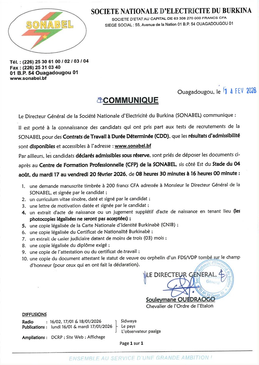 SONABEL : Publication des résultats d’admissibilité aux recrutements CDD et modalités de dépôt des documents