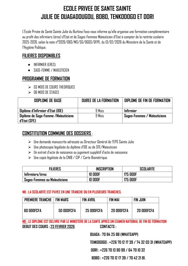 Ecole Privée de Santé Sainte Julie du Burkina Faso : Formation complémentaire 2025-2026 pour Infirmiers(ères) et Sages-femmes d’État